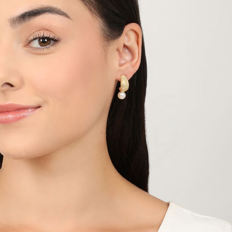 Brinco texturizado Morana com pérola. Banho Dourado.