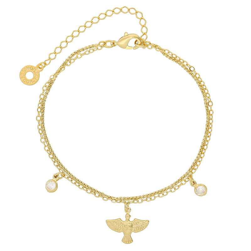 Pulseira dupla Morana com pingente Divino Espirito Santo e zircônias. Banho Dourado.